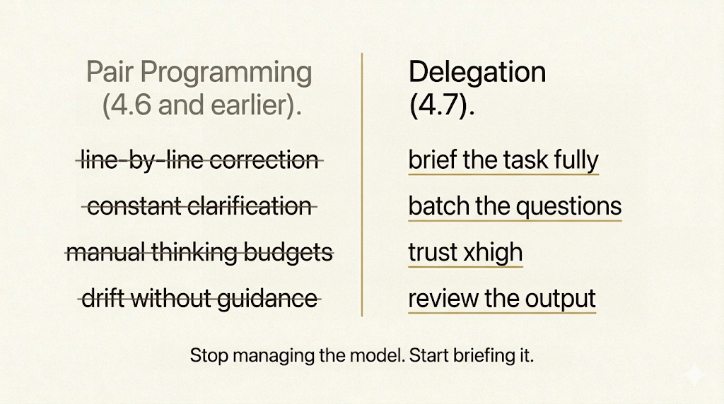 4.7 does not need that kind of oversight for most of a task. It is capable enough to be briefed and left alone to execute. Every one of the first four habits I walked through is a symptom of this bigger update. Loading the first turn, batching your questions, using xhigh, trusting the adaptive thinking. Those are all things you would do naturally if you were delegating to someone capable. They only feel like new habits because the old pair-programming reflexes are still in your hands.