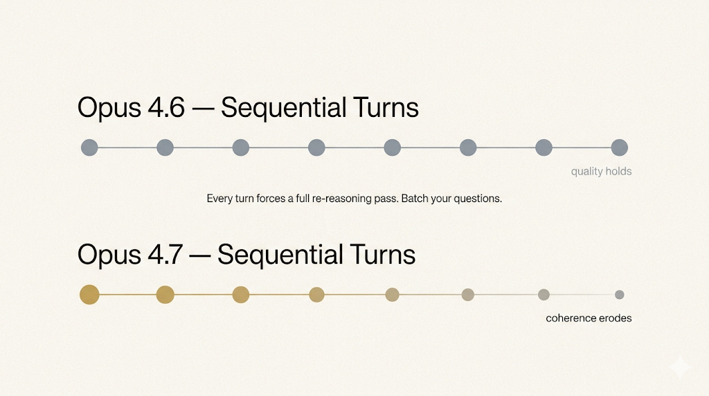 This flows from the same reasoning mechanics. Every user turn on 4.7 forces a full re-reasoning pass over the entire conversation. A quick “also, do this” follow-up looks cheap. It is not. Each of those quick follow-ups costs you the same reasoning overhead as a substantive new prompt.