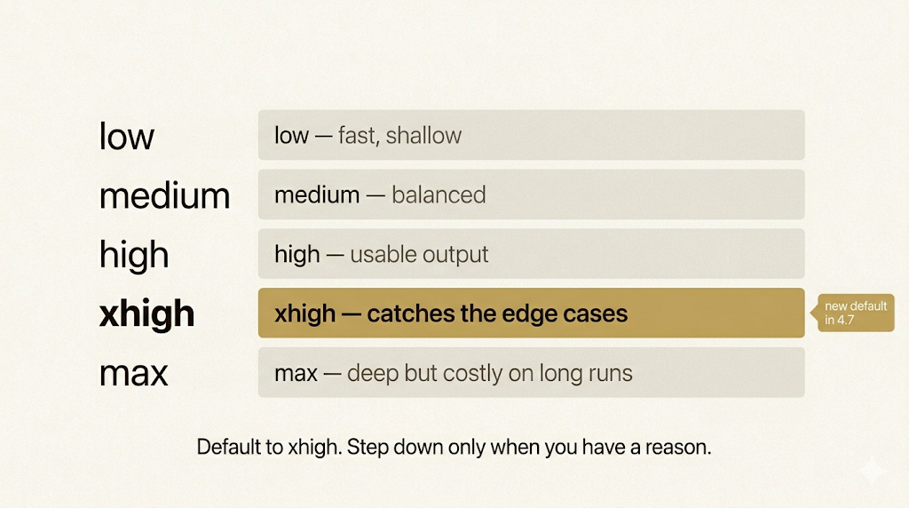 Claude Code lets you set effort levels that tell the model how hard to reason about a task. The options are low, medium, high, xhigh, and max. With 4.7, xhigh is new. It sits between high and max, and it is now the default.