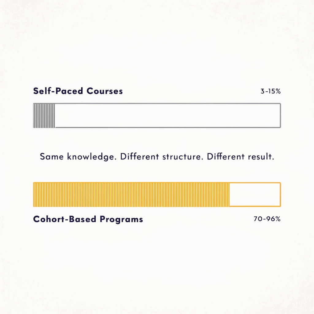 None of those forces exist in a self-paced course. In a self-paced course, the only accountability mechanism is the buyer’s discipline. And discipline, left to its own devices, is not a system. It is a wish.
