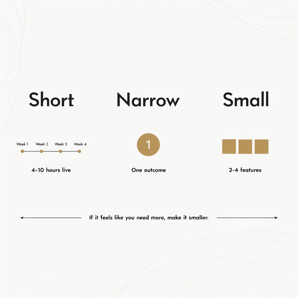 Short means four to ten hours of live content delivered across two to four weeks. Narrow means you solve one problem and deliver one outcome. Small means you include only two to four core features: live sessions, a handful of resources, homework assignments, and a community space. That is it.