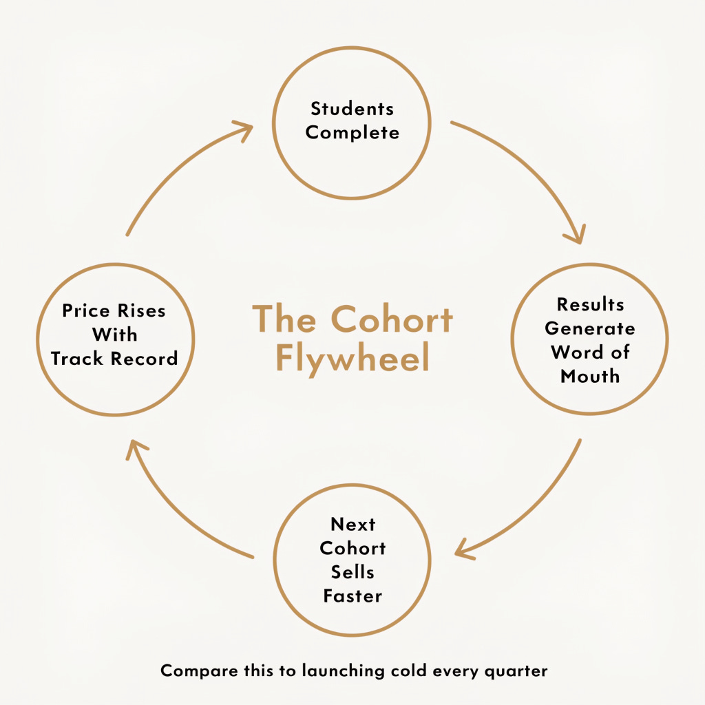When your students complete the program, they get results. When they get results, they tell other people. When other people hear about it from someone they trust, your next cohort sells faster with less effort. When each cohort sells faster, you can raise the price because the product has a track record. When the price rises alongside demand, you have a real business, not a launch treadmill.